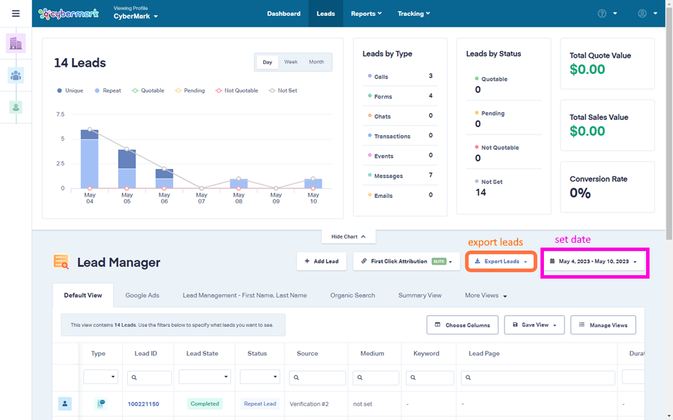 - Scroll down to the leads table below the chart, set the date range, and click the Export Leads icon